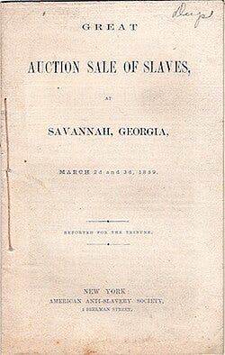 The Great Slave Auction (also called the Weeping Time) was an auction of enslaved Americans of African descent held at Ten Broeck Race Course, near Savannah, Georgia, United States, on March 2 and 3, 1859. Slaveholder and absentee plantation owner Pierce Mease Butler authorized the sale of approximately 436 men, women, children, and infants to be sold over the course of two days. The sale's proceeds went to satisfy Butler's significant debt, much from gambling. The auction was considered the largest single sale of slaves in U.S. history until the 2022 discovery of an even larger auction of over 600 slaves in Charleston, South Carolina.